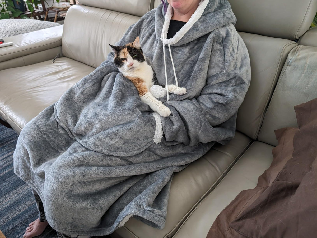 Oversized warm wearable blanket with pet pouch